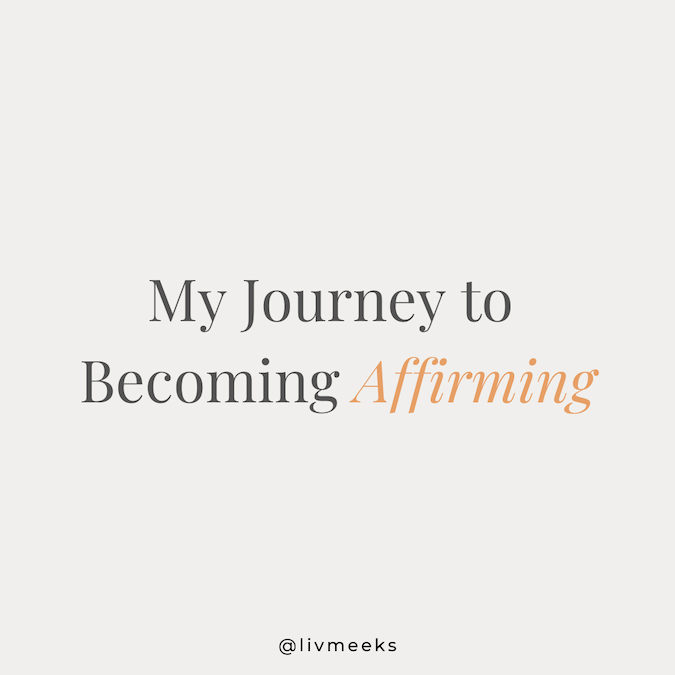 I recently shared some ideas of how I thought affirming Christians could be stronger allies to the LGBTQ+ community, one being more vocal about their journey to becoming affirming. I think many of us who grew up in Church communities didn’t grow up in an affirming environment and I am no exception. After I shared that push to allies, I thought, Wait, have I even shared mine?