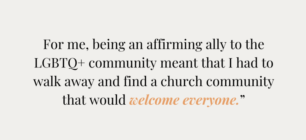 For me, being an affirming ally to the LGBTQ+ community meant that I had to walk away and find a church community that would welcome everyone.”